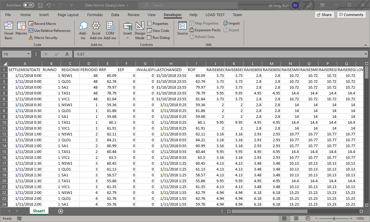 As with all the other tools data services allows you to load multiple data sets automatically. We have an XLSM file that demonstrates a simple case of loading 5 min price and demand from two separate reports. The macro is easy to modify to load any report, time period or instances. Excel sample