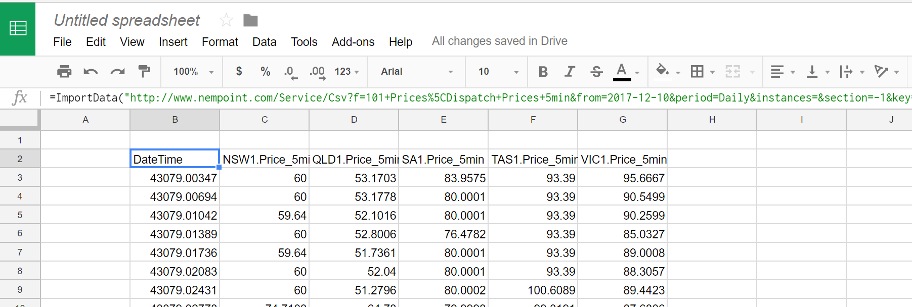 GS can read data in XML or CSV format but we recommend CSV format. The screen shot below shows reading data in by pasting a command like: =ImportData("https://www.neopoint.com.au/Service/Csv?f=101+Prices%5CDispatch+Prices+5min&from=2017-12-10&period=Daily&instances=§ion=-1&key=xxxx")