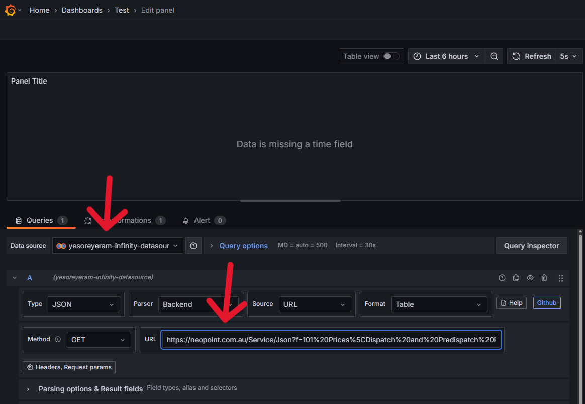 Now open up a panel in your dashboard and set the data source to “yesyoreyam-infinity-datasource” and paste the JSON link into the URL field. Also make sure type is set to JSON.
