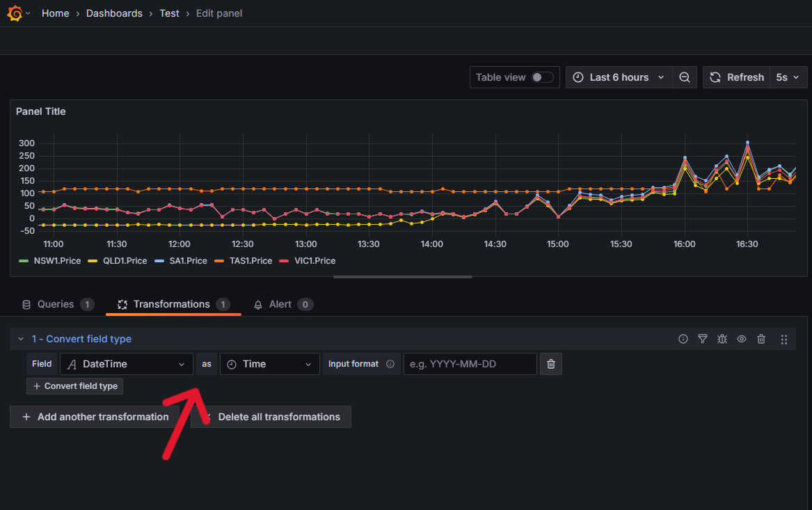Data should now be viewable under “table view” but wont show as a graph since Grafana doesn’t know the “DateTime” field is a “Time” data type.