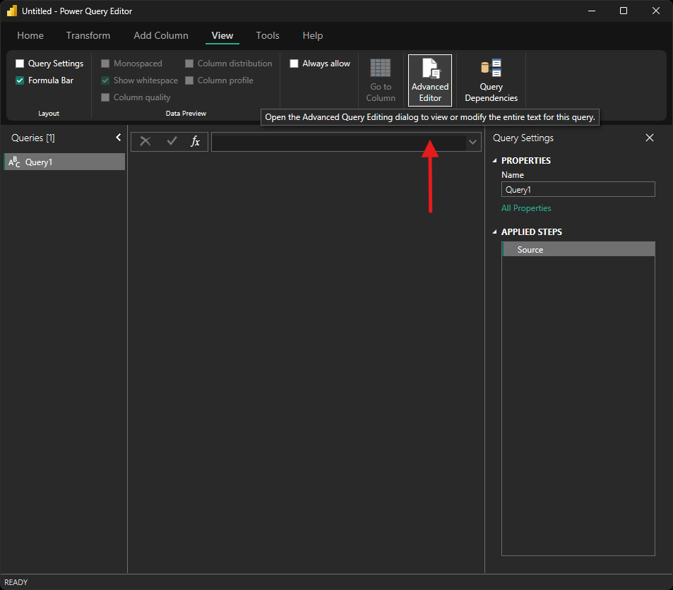 Once the Power Query Editor has loaded, navigate to the "Advanced Editor" which is located under the "View" tab.