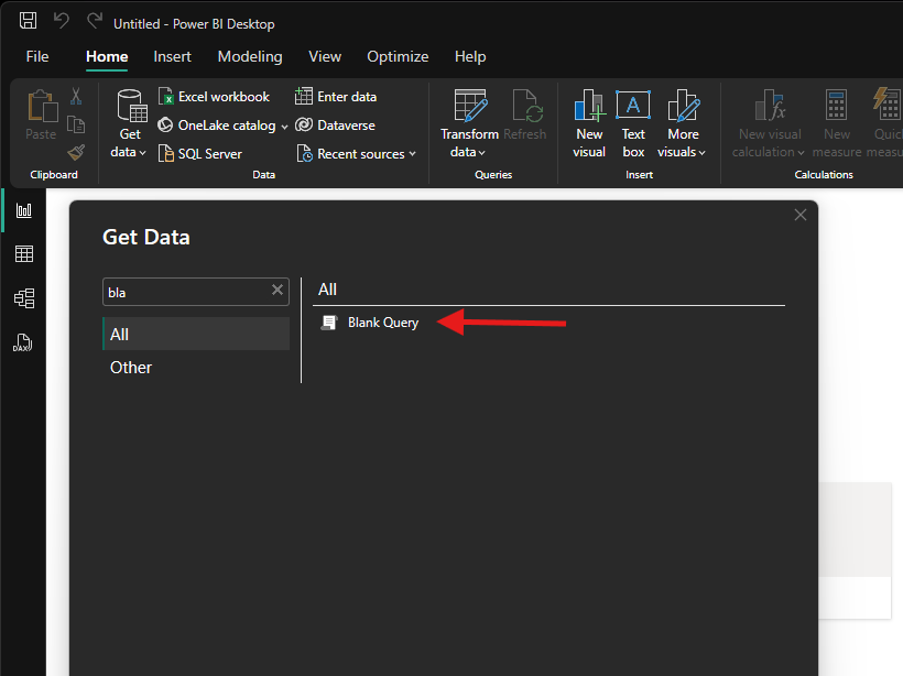 To get data from the data service using an SQL query, first you need to select “Blank Query” for the data source. This will open the Power Query Editor.