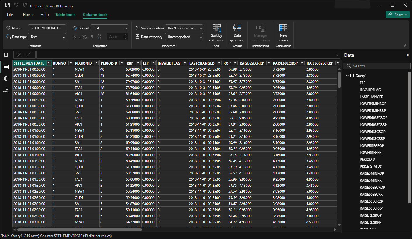query = '''select `SETTLEMENTDATE`, `RUNNO`, `REGIONID`, `PERIODID`, `RRP`, `EEP`,