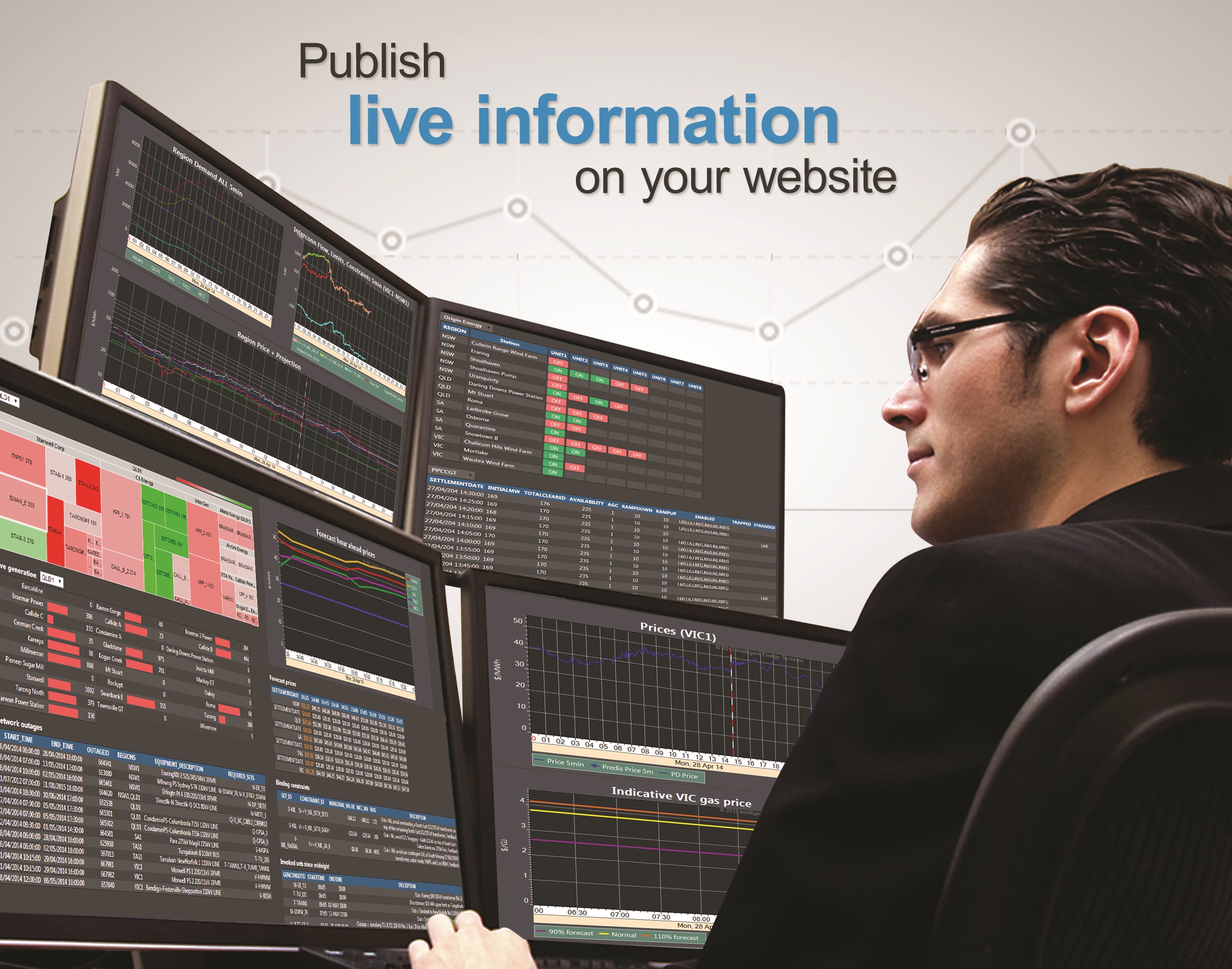 Create interactive web pages that allow you to set alerts, threshold levels etc. Alerts can trigger emails or SMS.