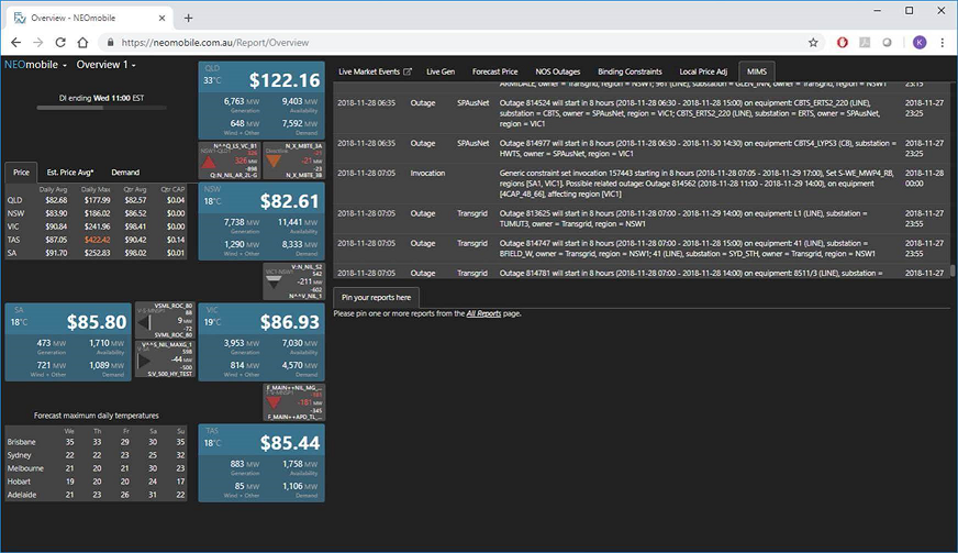 We have added a new subsystem to NEOmobile called MIMS which stands for MITC Information Management System. While mostly of interest to TNSPs we are making it generally available for a limited time – feedback as always is welcome! For background under the AER’s MITC scheme, TNSPs are financially punished by between $4k and $15k (varies for each TNSP) for every constraint related to the outage that binds with an absolute marginal value greater than or equal to $10.