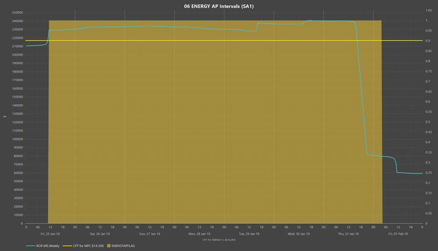 The “Administered Pricing – ENERGY” report shows time intervals for when administered pricing applies in the selected region. This is indicated by ENERGYAPFLAG = 1 and is sourced from the APEVENT and APEVENTREGION tables. The chart also calculates the cumulative trading interval energy price for the selected region over the previous 336 trading intervals (1 week) from the DISPATCHPRICE table. The ROP price capped at the Market Price Cap ($14,500) is used in the calculation. When this value exceeds the Cumulative Price Threshold ($216,900), administered pricing for all services is triggered in the region and remains so while the CPT is exceeded and until the end of that trading day. When triggered, energy prices are bounded by the Administered Price Cap ($300/MWh) and the Administered Floor Price (-APC). The CPT is updated each financial year.