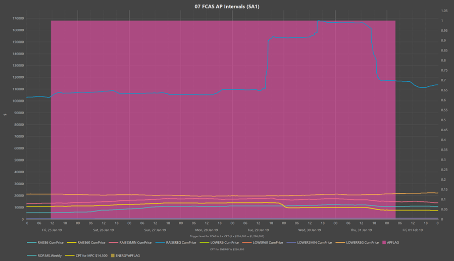 The “Administered Pricing – FCAS” report shows time intervals for when administered pricing applies in the selected region and FCAS service. This is indicated by the service APFLAG = 1 and is sourced from the APEVENT and APEVENTREGION tables. The chart also reports the 5 minute cumulative price for the selected FCAS service from the DISPATCHPRICE table. The cumulative price is for the previous 2016 dispatch intervals (1 week). When this value is 6 x CPT (6 x 216,900 = $1,296,000), administered pricing for all FCAS services is triggered in the region. Note that administered pricing for FCAS services is also triggered if the cumulative energy price for the previous 336 trading intervals exceeds the CPT value.