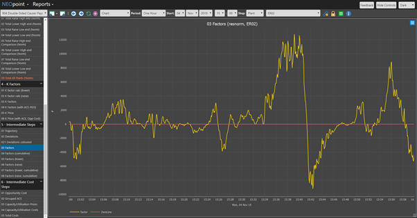 The scale of the causation or provision depends on the relative magnitudes of the unit’s deviation and ACE-REG. This can be further quantified by the product of the 2 quantities (labelled the unit’s 4-second performance factor); a positive factor implies that the unit is providing power to reduce frequency deviation for that 4sec interval while a negative factor implies that the unit is causing an further imbalance in that interval. ER02’s performance factors for the selected period are given in figure 5. Notice the peaks between 15:35 to 15:45, they coincide with periods of high ACE-REG (both positive and negative)