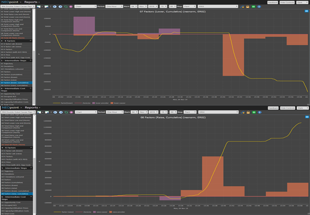 Figure 6 - Top: Lower 5min factors (provider: orange, causer: purple) and cumulative lower 4sec performance factors (yellow), bottom: Raise 5min factors and cumulative raise 4sec performance factors (for ER02)